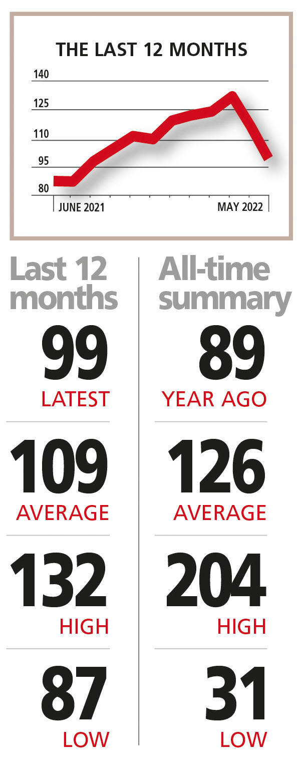 THE INDEX So there are no surprises as the LMD-NielsenIQ Business Confidence Index (BCI) stays on its slippery course, sliding a perilous 17 basis points to 99 in May from its lowest level this year of 116 in April.