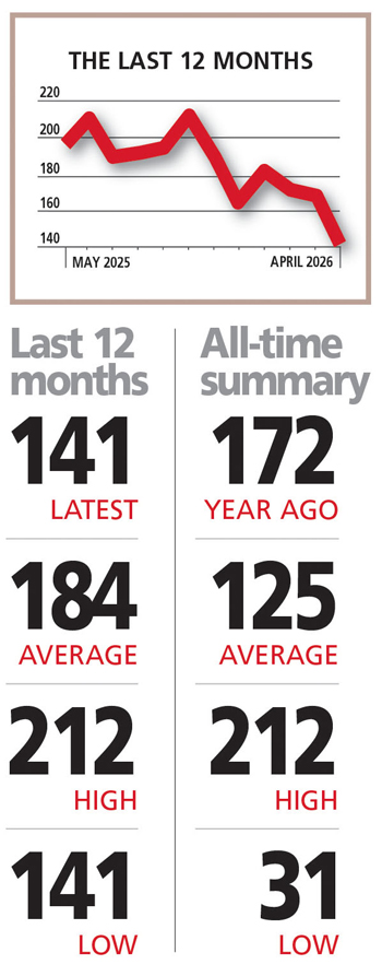 The barometer remains 46 points higher than its historic median of 125 but sits 18 points below the 12 month average (189). By comparison, the index stood at 204 in February last year – 33 points higher than the current reading.