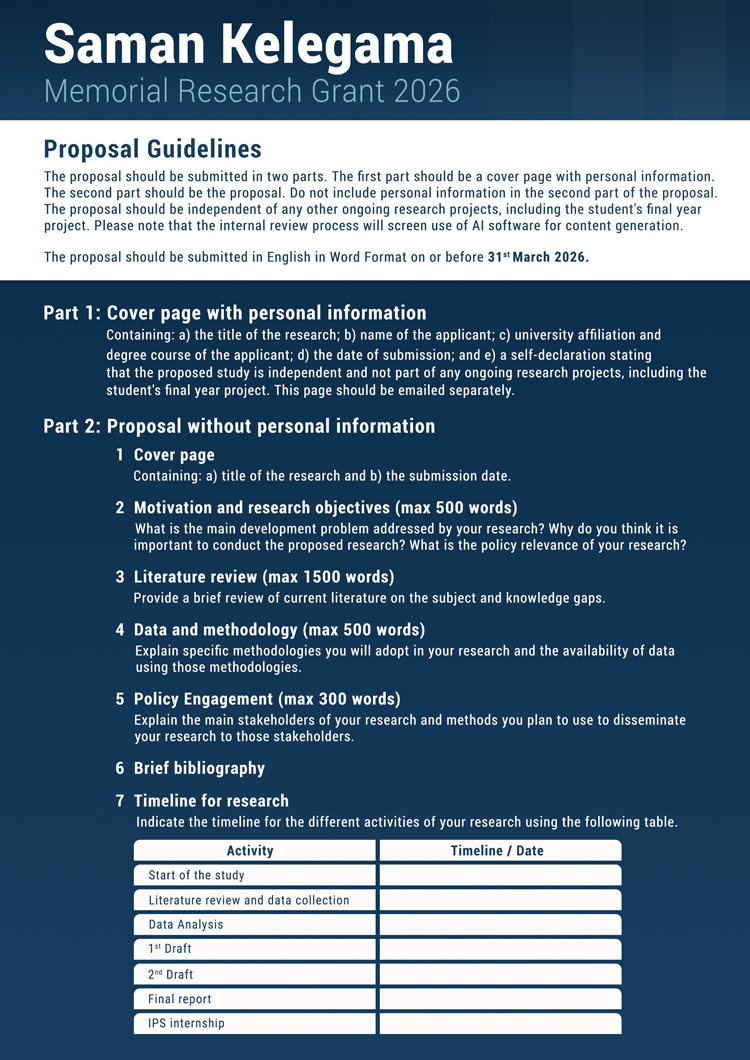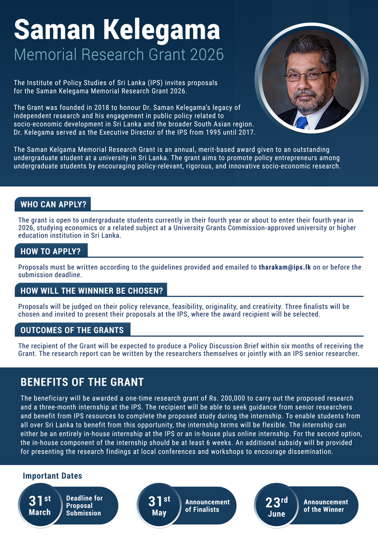 The Institute of Policy Studies of Sri Lanka (IPS) calls for applications for the Saman Kelegama Memorial Research Grant 2026, established in 2018 in memory of Dr. Saman Kelegama, former Executive Director of IPS, to support policy‑relevant socio‑economic research by undergraduate students.