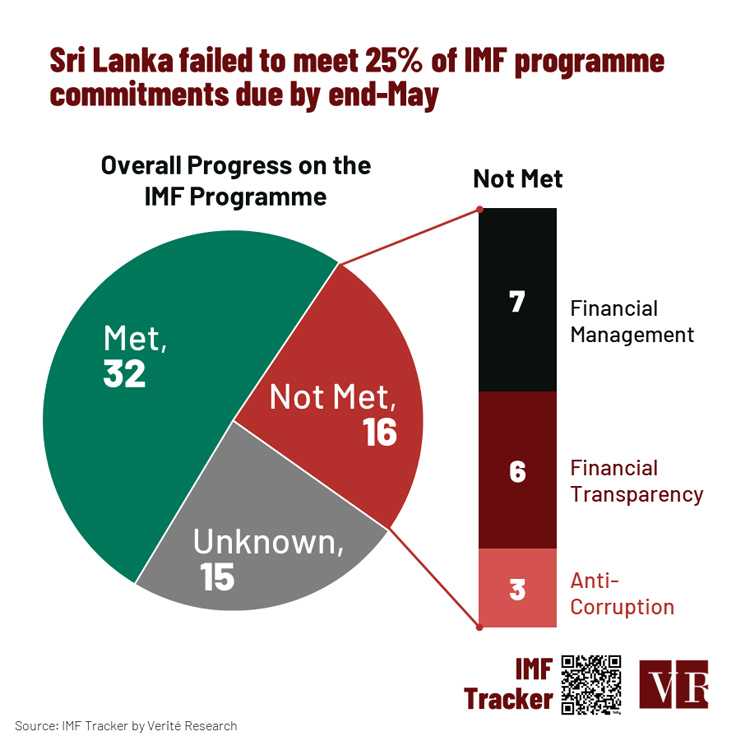On June 12, the IMF board will sign off on Sri Lanka’s third disbursement under the current programme. But Sri Lanka is still failing on the governance improvements that are foundational for its economic recovery. According to the latest update of the ‘IMF Tracker’ by Verité Research, Sri Lanka verifiably failed to meet 25% of…