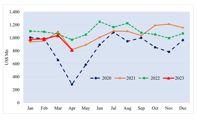 Sri Lanka’s Export Performance in April 2023 Sri Lanka’s merchandise exports decreased by 16.15 % to US$ 814.1 Million in April 2023 compared to April 2022. Moreover, it is a 0.5 % decrease when compared to April 2021. Declining trend in merchandise exports further continues due to the negative trends shown in major export products….