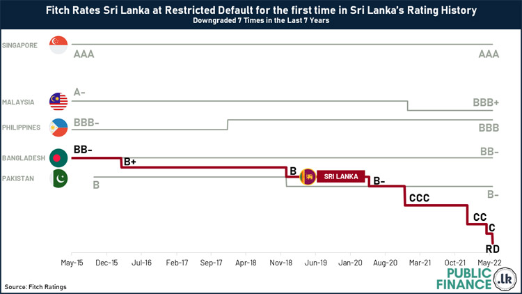 Sri Lanka’s credit rating has been downgraded 7 times over the course of 7 years (May 2015 – May 2022). 5 of those downgrades occurred since April 2020. In contrast, its regional peers have maintained their credit ratings. The recent downgrade to RD (Restricted Default) on the 19th of May 2022 was immediately after…