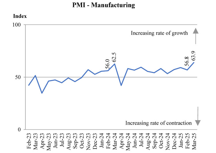 Sri Lanka Purchasing Managers’ Index for Manufacturing (PMI – Manufacturing) reached 63.9 in March 2025, recording its highest value in four years. All sub-indices posted month-on-month expansions, reflecting a notable improvement in manufacturing activities, driven by the strong seasonal demand. The sharp increases in the New Orders and Production sub-indices, particularly within the food and…