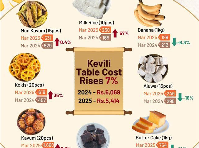 Analysis finds cost of ingredients has more than doubled since 2019 The cost of preparing a traditional “kevili” table for the Sinhala and Tamil New Year has increased by 7% in 2025 compared to 2024, and stands more than twice as high as it was in 2019. This was revealed in the annual ‘New Year…