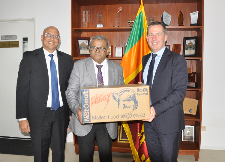 Nestlé Lanka donates food and beverage products to communities worst-impacted by the recent floods through the Disaster Management Centre. Photo : (Left to right) Mr. Ruwan Welikala, Director – Corporate Affairs and Communications, Nestlé Lanka, Major General H. M. U. Herath (RETD), Director General – Disaster Management Centre and Mr. Bernhard Stefan, Managing Director –…