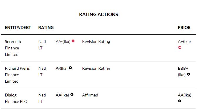 Fitch Ratings has revised Serendib Finance Limited’s National Long-Term Rating to ‘AA-(lka)’, from ‘A+(lka)’, with a Negative Outlook, and that of Richard Pieris Finance Limited (RPF) to ‘A-(lka)’, from ‘BBB+(lka)’, with a Stable Outlook. Fitch has also affirmed Dialog Finance PLC’s (DF) National Long-Term Rating at ‘AA(lka)’ with a Stable Outlook. KEY RATING DRIVERS Serendib…