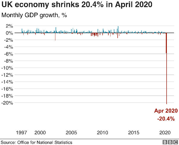 BBC – The UK’s economy shrank by 20.4% in April – the largest monthly contraction on record – as the country spent its first full month in lockdown. The Office for National Statistics (ONS) said the “historic” fall affected virtually all areas of activity. The contraction is three times greater than the decline seen during the…