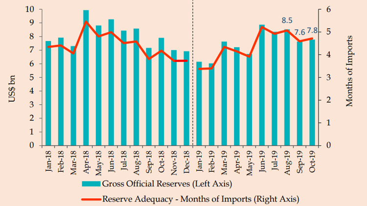Gross official reserves of Sri Lanka were estimated at US $ 7.8 billion at end October 2019, equivalent to 4.7 months of imports, the latest external sector data outlines. Further, the total foreign assets consisting of gross official reserves and foreign assets of the banking sector amounted to US dollars 10.4 billion at end October…