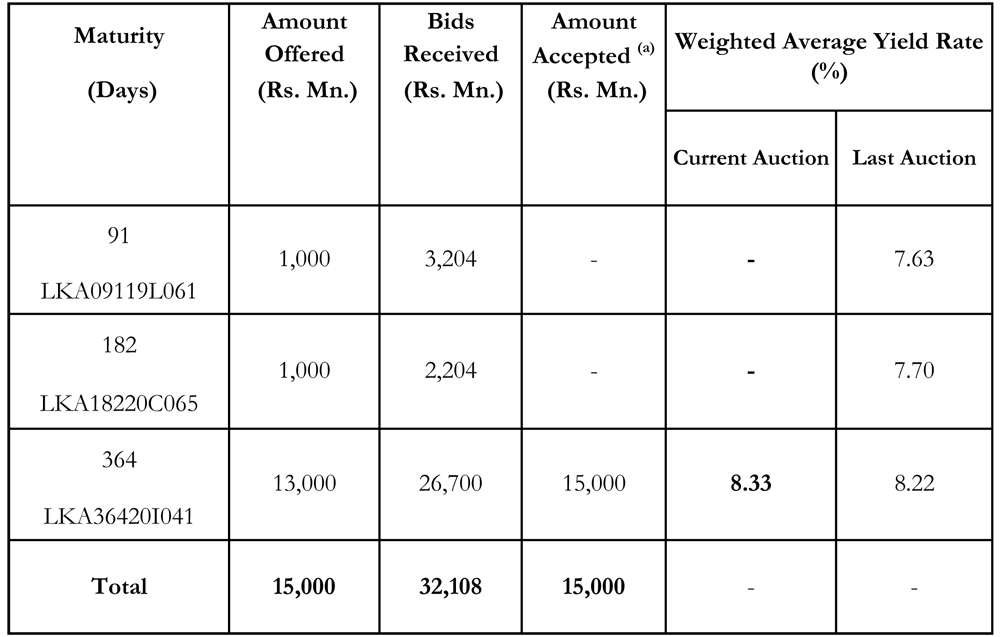 Sri Lanka’s Treasury Bill yields showed a upward trend at the weekly primary auction today with the one year yield increasing by eleven basis points to 8.33%. The average weighted yield at the last auction was 8.22%. The auction was oversubscribed with bids amounting to Rs. 32,108 million being received. The Central Bank of Sri Lanka…