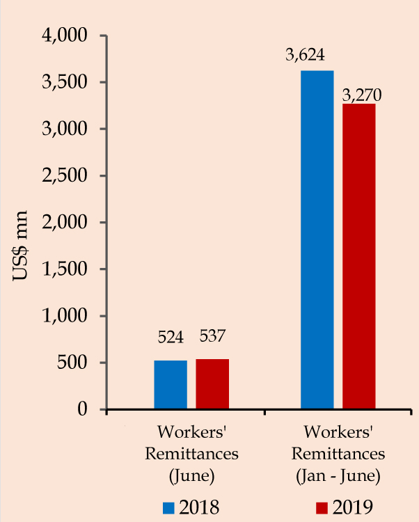 Workers’ remittances grew by 2.5%, year-on-year, to US dollars 537 million in June 2019, latest External Sector Performance report of the Central Bank of Sri Lanka outlines. On a cumulative basis, however, workers’ remittances recorded a decline of 9.8% reaching US dollars 3,270 million during the first half of 2019 in comparison to the corresponding…