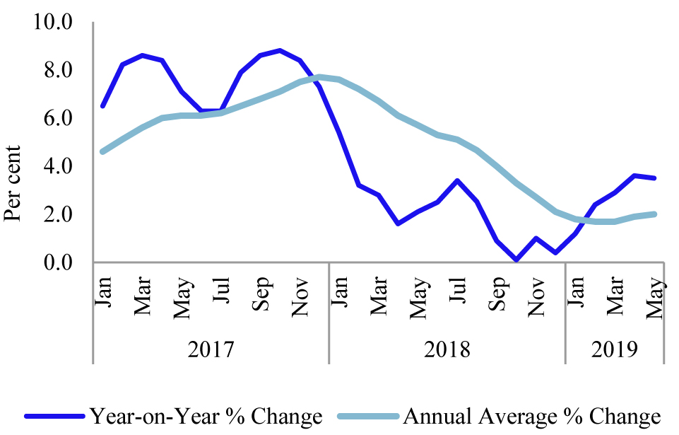 Headline inflation as measured by the year-on-year change in the National Consumer Price Index (NCPI, 2013=100)1 decreased to 3.5 per cent in May 2019 from 3.6 per cent in April 2019 due to the high base prevailed in the corresponding month of the previous year. Meanwhile, in May 2019, year-on-year Food and Non-food inflation recorded…