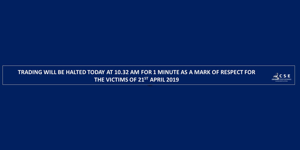 The Colombo Stock Exchange will be observing a minute’s silence this morning (23rd April 2019) once the Regular Trading session commences after the Open Auction (at around 10.32 a.m.) on the Automated Trading System (ATS) as a mark of respect to the victims of the tragic events that took place in Sri Lanka on Sunday…