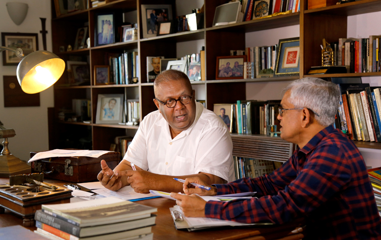 The Minister of Finance Mangala Samaraweera is in deep conversation with the Treasury Secretary Dr. R.H.S. Samaratunga to make the final touches to the Budget -2019 at the Minister’s “Rainbow End” private residence at Gorakana- Panadura Sunday. Minister Mangala Samaraweera will commence the Budget Speech at 1.30 pm on Tuesday in the Parliament.