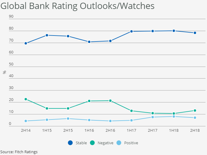 The number of bank ratings on Negative Outlook has increased since the middle of last year, Fitch Ratings says. The share of Negative Outlooks globally rose to 13% at end-2018 from 10% at end-1H18, following sovereign-driven Outlook revisions in Italy and Latin America, while the share of Positive Outlooks decreased slightly to 7% (end-1H18: 8%)….