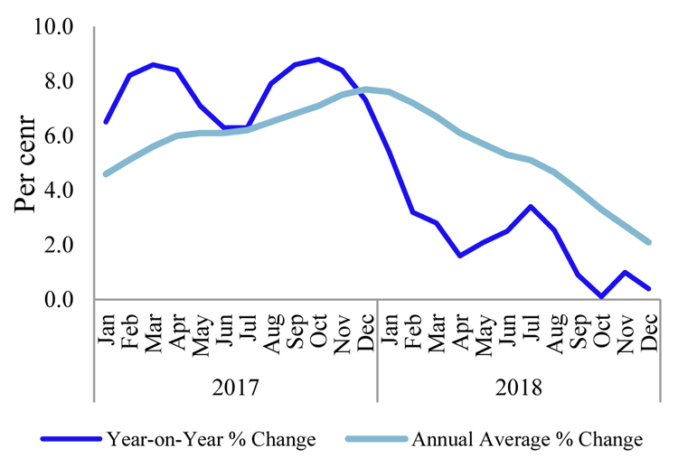 Headline inflation as measured by the year-on-year change in the National Consumer Price Index (NCPI, 2013=100) decreased to 0.4 per cent in December 2018 from 1.0 per cent in November 2018. The decrease observed in year-on-year inflation in December 2018 is driven by the decrease of prices of items in both Food and Non-food categories. Year-on-year Food inflation decreased to -4.5 per cent…