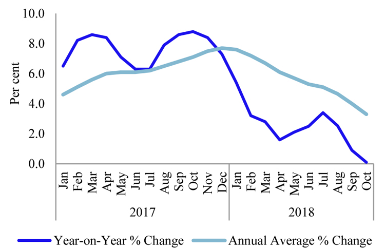 Headline inflation as measured by the year-on-year change in the National Consumer Price Index (NCPI, 2013=100) continued to decline for the third consecutive month, recording 0.1 per cent in October 2018, the lowest since January 2016. The deceleration observed in year-on-year inflation in October 2018 is mainly driven by the higher base prevailed during the…