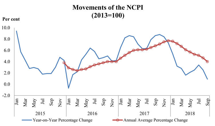 Headline Inflation, as measured by the change in the National Consumer Price Index (NCPI, 2013=100), which is compiled by the Department of Census and Statistics (DCS), decreased to 0.9 per cent in September 2018, the lowest since January 2016, from 2.5 per cent in August 2018 on year-on-year basis. The deceleration in year-on-year inflation in…