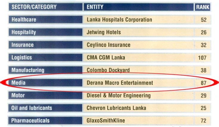 Derana has been named the most respected media entity in Sri Lanka by LMD magazine in its latest compilation of Sri Lanka’s most respected entities. Just 13 years old, Derana is a premium entertainment and news channel offering multichannel access including television, radio, and online services. The recognition is a landmark honour in the growth trajectory of Derana, which has been consecutively rated No. 1…