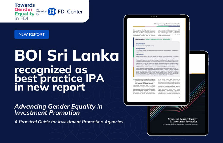 The leading FDI Strategist, The FDI Center, published the report “Advancing Gender Equality in Investment Promotion: A Practical Guide for IPAs”, in which BOI Sri Lanka was featured as a best practice case study for recommendation 2.4 of the report: Conduct regular staff training sessions promoting gender equality and women’s empowerment. The BOI is recognized for…