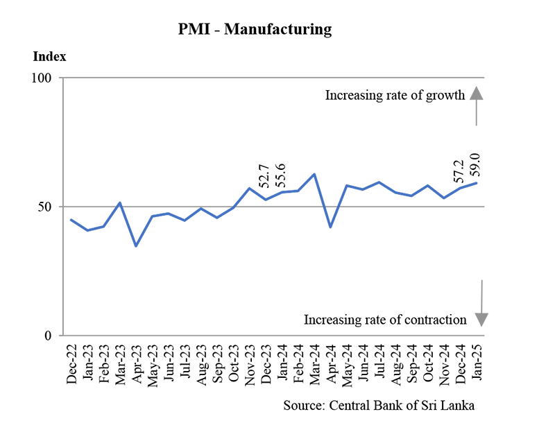 Purchasing Managers’ Indices indicate expansions in both Manufacturing and Services activities in January 2025. Sri Lanka Purchasing Managers’ Index for Manufacturing (PMI – Manufacturing) recorded an index value of 59.0 in January 2025, indicating a further expansion in manufacturing activities. All sub-indices contributed positively to this improvement. Most of the survey participants from the manufacture…
