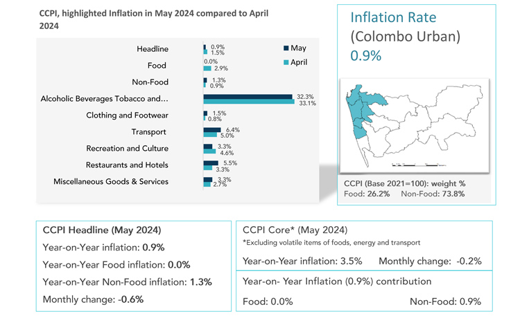 Headline inflation, as measured by the year-on-year (Y-o-Y) change in the Colombo Consumer Price Index (CCPI, 2021=100) decelerated to 0.9% in May 2024 from 1.5% in April 2024. This deceleration in the headline inflation is broadly in line with the projections of the Central Bank of Sri Lanka (CBSL). Food inflation (Y-o-Y) decelerated to 0.0%…