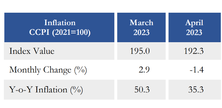 Headline inflation, as measured by the year-on-year (Y-o-Y) change in the Colombo Consumer Price Index (CCPI, 2021=100) decreased to 35.3% in April 2023 from 50.3% in March 2023. The lower level of realised inflation compared to the projections made, was mainly due to higher than expected price decreases observed in Volatile Food and Non-Food items….
