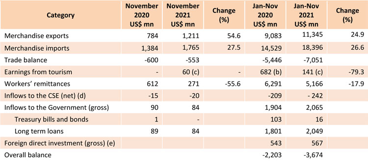 Earnings from exports in November 2021 recorded the highest monthly export value in the history, while marking the sixth consecutive month of above US dollars 1.0 billion of exports. Meanwhile, import expenditure also increased at a higher rate in November 2021. Reflecting the favourable impact of increased exports, the merchandise trade deficit narrowed to US…