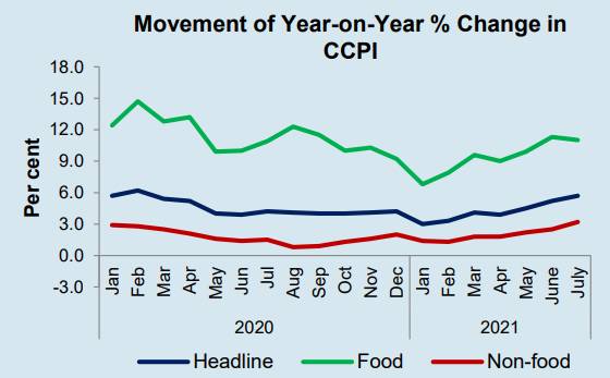 Headline inflation, as measured by the year-onyear (Y-o-Y) change in the Colombo Consumer Price Index (CCPI, 2013=100)1 , increased to 5.7 per cent in July 2021 from 5.2 per cent in June 2021. This was driven by monthly increases of prices of items in the Non-food category. Subsequently, Food inflation (Y-o-Y) decreased to 11.0 per…