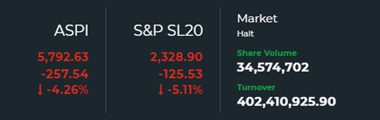 Regular trading at the Colombo Stock Exchange (CSE) was temporarily halted for 30 minutes from 11.07 am to 11.37 am this morning (05) as S&P SL20 index dropped by 5% during the trading session. S&P SL20 index fell 125.53 points or 5.11% to 2,328.90 and the All Share Price Index also fell 4.26% or 257.54 points in early trade to 5,792.63. The market turnover…
