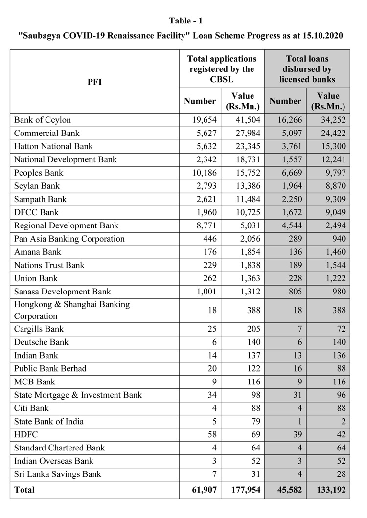 The Central Bank of Sri Lanka, as of 15th October 2020, approved 61,907 loan applications received from COVID-19 affected businesses. These applications were for a total of Rs. 177,954 million and registered under the three Phases of the Saubagya COVID-19 Renaissance Facility. So far, the Licensed Banks have released loans amounting to Rs. 133,192 million among 45,582 affected businesses island-wide (See Table 1 for details).
