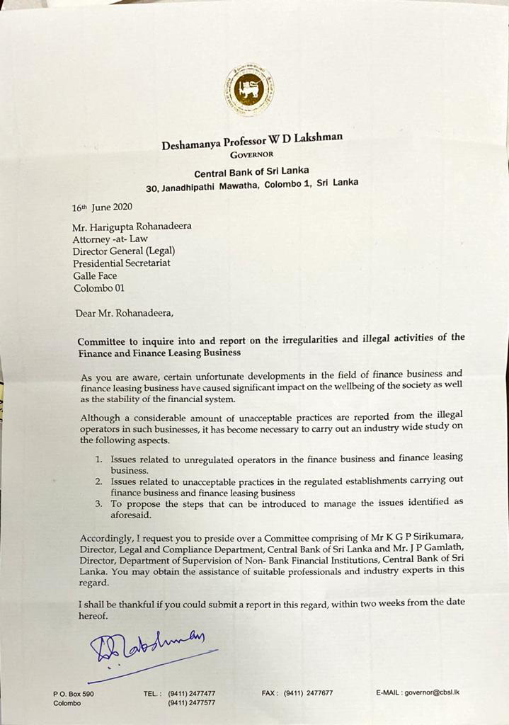 In a letter addressed to Director General of Legal Affairs of the Presidential Secretariat, Attorney-at-Law Harigupta Rohanadeera, Central Bank Governor Deshamanya Prof. W.D. Lakshman has made a request for a report on the irregularities and illegal activities of the finance and finance leasing business.