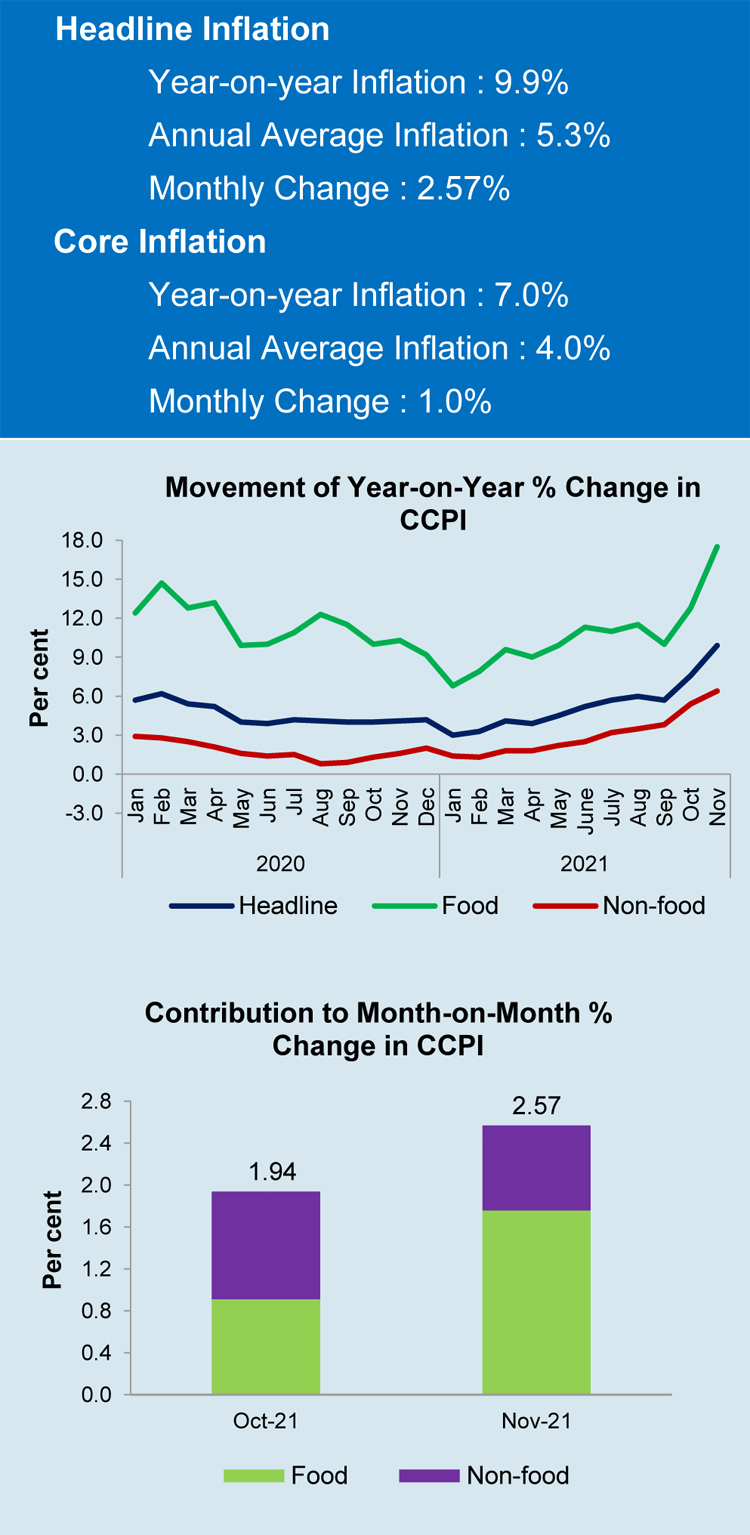 Headline inflation, as measured by the year-onyear (Y-o-Y) change in the Colombo Consumer Price Index (CCPI, 2013=100), increased to 9.9 per cent in November 2021 from 7.6 per cent in October 2021. Meanwhile, the CCPI measured on an annual average basis, increased to 5.3 per cent in November 2021 from 4.8 per cent in October 2021.