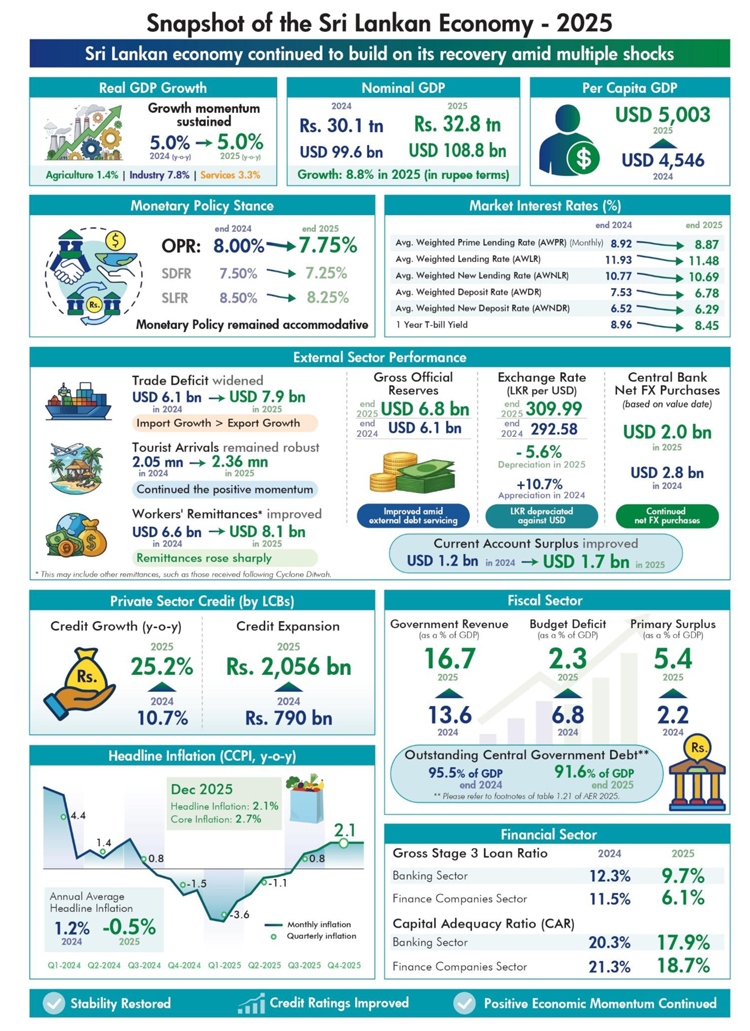 Economic activity remained robust in 2025, with real GDP growth estimated at 5%, marking the second consecutive year of expansion. Labour market conditions improved alongside the recovery, and inflation turned positive from August 2025 following a period of deflation, largely driven by easing energy-related price declines and higher food prices, with demand remaining firm. Lower interest rates, reflecting relaxed monetary conditions, led to a notable expansion in credit to the private sector. The removal of restrictions on vehicle imports contributed to higher imports and credit demand during the year. External sector performance strengthened further, with the current account recording a surplus for the third consecutive year, particularly supported by the historically high levels of workers’ remittances, along with improved services exports, despite a widening trade deficit. These foreign exchange inflows enabled the continued build-up of reserves amid external debt service payments, while the Sri Lanka rupee recorded a modest depreciation under the flexible exchange rate regime. Fiscal performance remained strong, with the primary balance recording a surplus for the third consecutive year, underpinned by revenue-based fiscal consolidation measures, alongside continued efforts to support vulnerable groups. Financial sector performance also improved amid strengthened macroeconomic conditions. The profitability of both bank and non-bank financial institutions improved in 2025, alongside notable enhancements in asset quality, largely supported by robust credit expansion. Liquidity and capital buffers of banks and finance companies remained well above regulatory minimum requirements, reflecting the strengthened resilience of the financial sector.