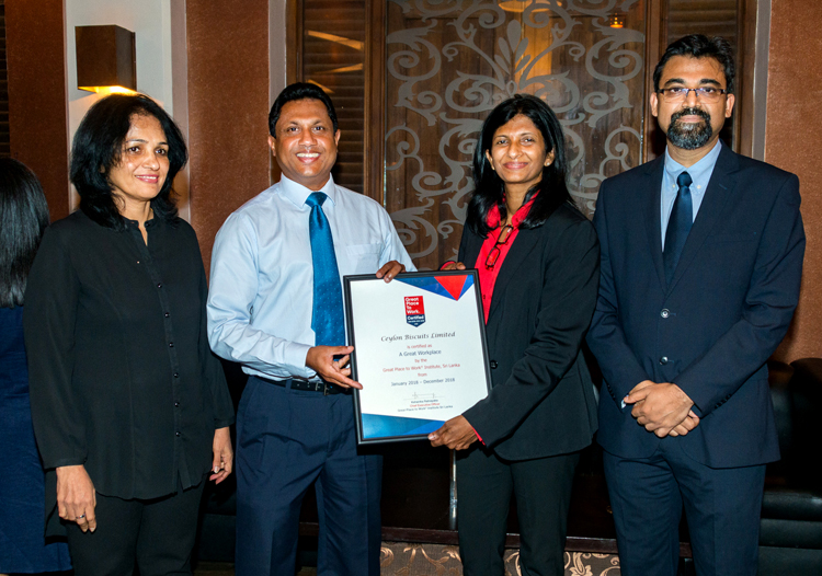 Ceylon Biscuits Limited (CBL), one of the fastest growing and largest conglomerates in Sri Lanka, recently announced that they received the prestigious Great Place to Work® Certification for 2018. Mr. Nalin Karunaratne Chief Executive Officer and Ms. Kumudini Welmillage Director Corporate HR received the globally recognized Great Place to Work® certification on behalf of CBL at a ceremony held in Colombo from Mr. Prasenjit Bhattacharya – CEO of Great Place to Work® Institute, India & Director of Great Place to Work® Institute, Sri Lanka and Mrs. Kshanika Ratnayaka – CEO of Great Place to Work® Institute, Sri Lanka who graced the occasion.