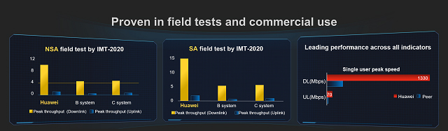 The third chart compares the speeds of a commercial 5G network deployed by several vendors. This is a real customer network. On Huawei 5G, single user speed reaches 1.3 Gbps.