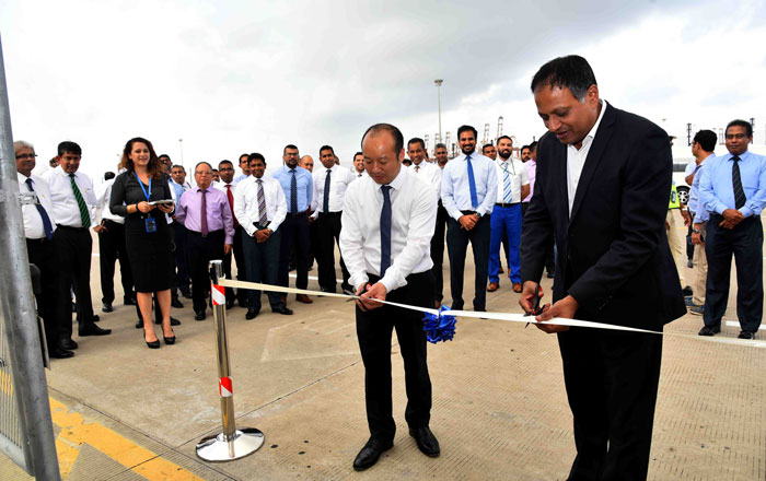 Sri Lanka Ports Authority Chairman Mr Kavan Rathnayake (above, right) and CICT CEO Mr Jack Huang ceremonially open CICT’s Dangerous Goods Storage Facility.