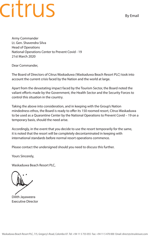 The Board of Directors of Citrus Waskaduwa (Waskaduwa Beach Resort PLC) took into account the current crisis faced by the Nation and the world at large.