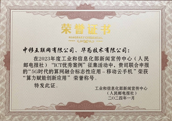 China Mobile and Huawei's joint cloud phone innovation was awarded the 2023 "Compute-enabled Innovative Application" by China People's Posts and Telecommunications News. The publication of China's Media and Communication Department, Ministry of Industry and Information Technology (MIIT), named Mobile Cloud Phone an outstanding ICT success story, recognizing the two companies’ contributions to 5G service innovation, enhanced user experience, and wider access to computing power.