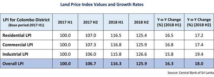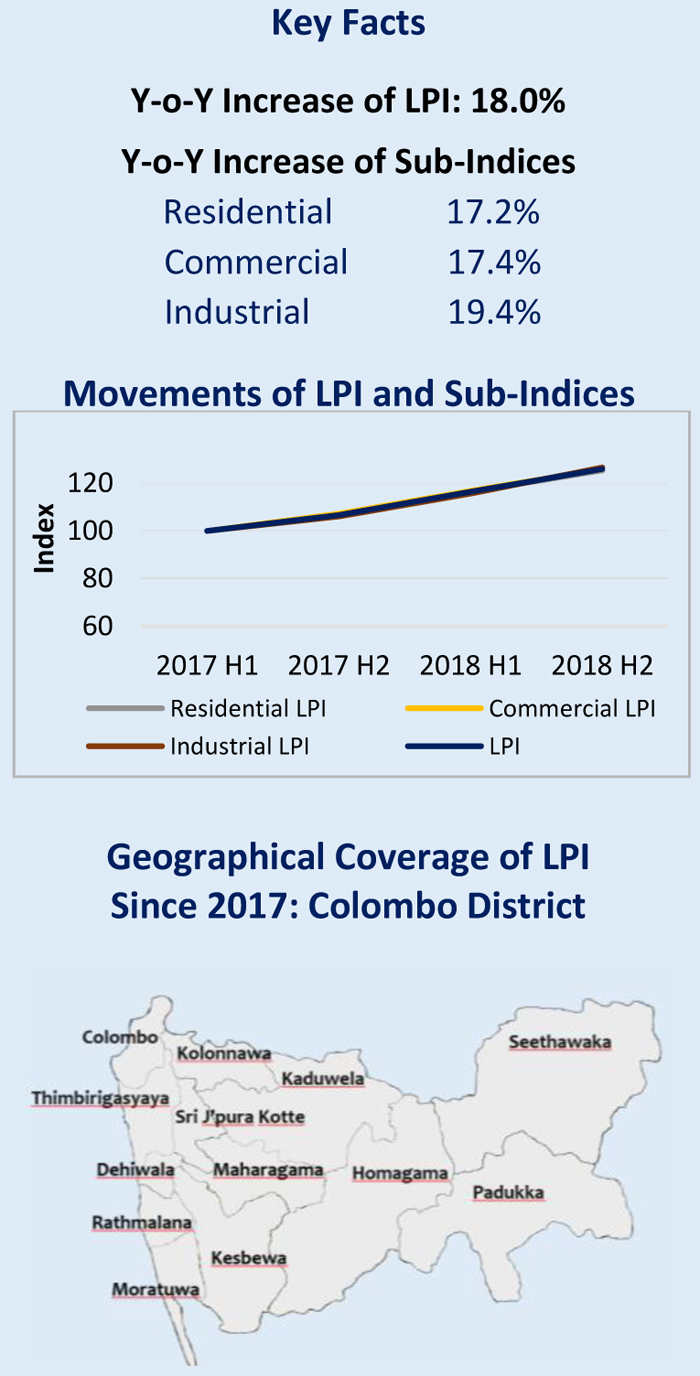 Land Price Index (LPI) for Colombo District, compiled by the Central Bank of Sri Lanka (CBSL), reached 125.9 during the 2nd half of 2018, recording an increase of 18 per cent compared to the 2nd half of 2017. The three sub-indices of LPI, namely residential, commercial and industrial have contributed to this increase.