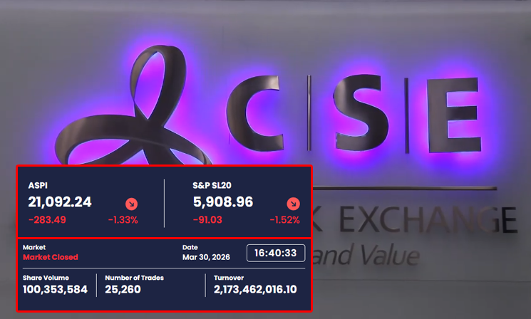 The All Share Price Index (ASPI) fell by 283.49 points to close at 21,092.24, while the S&P SL20 Index declined by 91.03 points to settle at 5,908.96 by the end of the trading session.