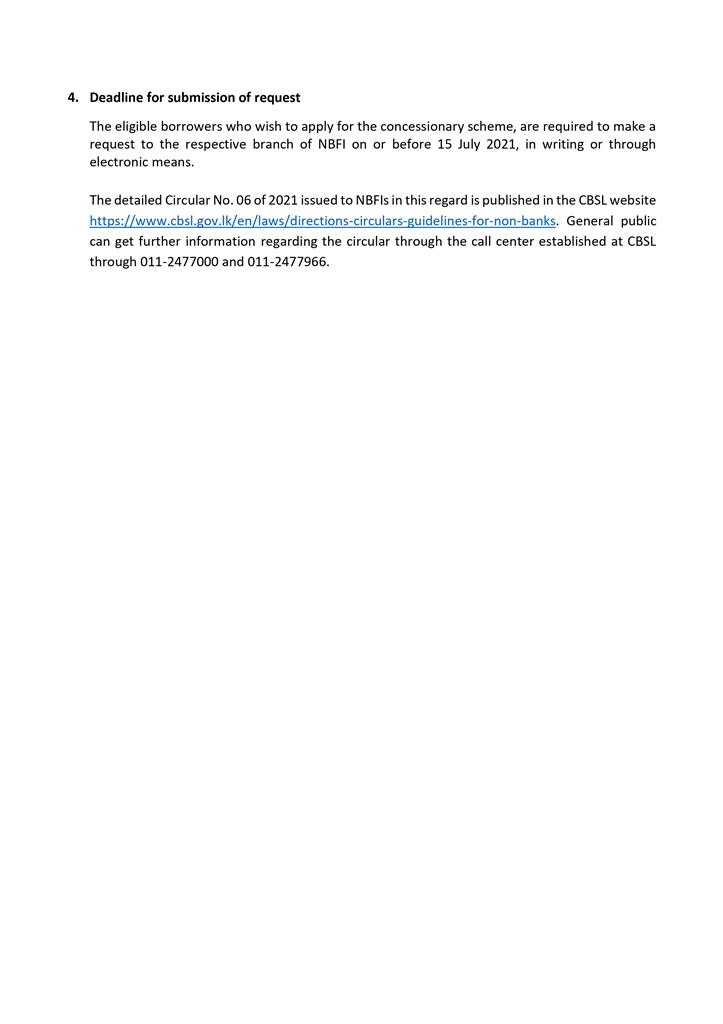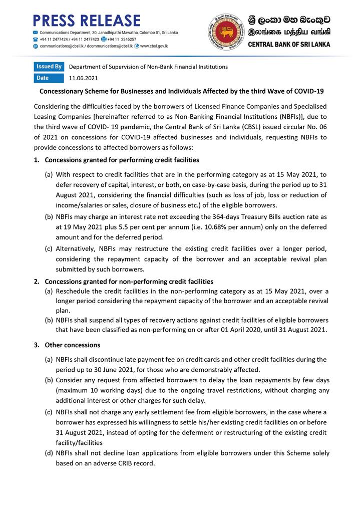 Considering the difficulties faced by the borrowers of Licensed Finance Companies and Specialised Leasing Companies [hereinafter referred to as Non-Banking Financial Institutions (NBFIs)], due to the third wave of COVID- 19 pandemic, the Central Bank of Sri Lanka (CBSL) issued circular No. 06 of 2021 on concessions for COVID-19 affected businesses and individuals, requesting NBFIs to provide concessions to affected borrowers as follows:
