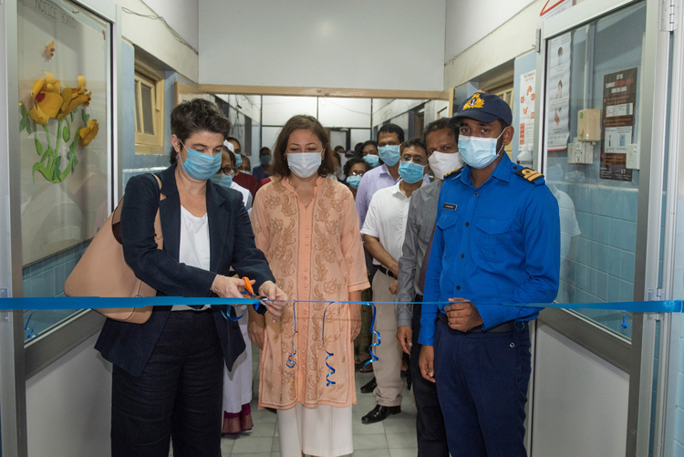 Photo - Opening of the isolation and treatment unit at the Lady Ridgway Hospital. Left to Right: Ms. Emma Brigham, Deputy Representative, UNICEF Sri Lanka, Dr. Safina Abdulloeva, Child Survival and Development Programme Manager, UNICEF Sri Lanka, Dr Kosala Karunaratne Consultant Paediatrician LRH, Dr Wijesuriya Director LRH and Mr. K.S Maussawala, Lieutenant, Project Engineer to LRH, Sri Lanka Navy