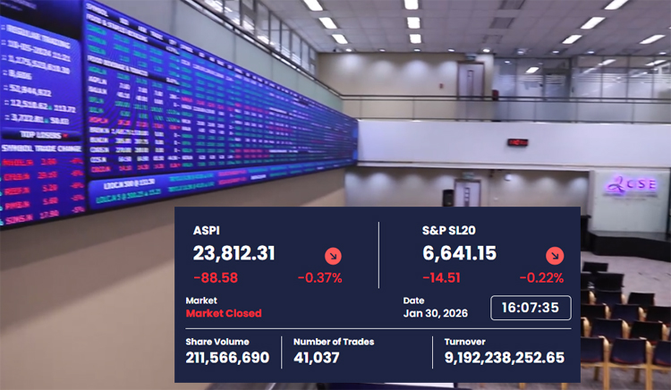 The All Share Price Index (ASPI) declined by 88.58 points to close at 23,812.31, while the S&P SL20 Index fell by 14.51 points to 6,641.15.