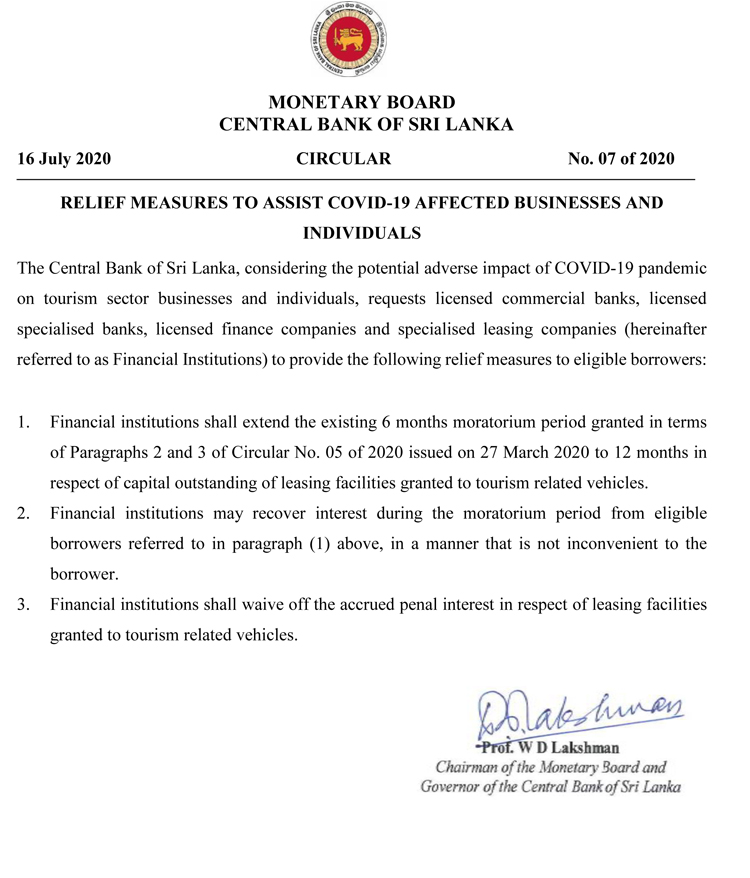 Hence, issuing a circular yesterday (16) the CBSL requested all licensed commercial banks, licensed specialised banks, licensed finance companies and specialised leasing companies (hereinafter referred to as Financial Institutions) to provide the following relief measures to eligible borrowers: