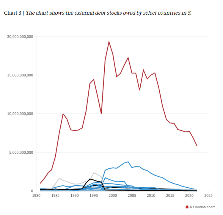 As can be seen from the chart, the debt owed by South Asian, African, and South American countries to China increased significantly post the 2010s. According to the World Bank’s latest International Debt Report 2023, this was due to China’s ‘Going Global Strategy’, which was initiated in 1999 to improve Chinese investment and lending abroad. By the end of 2022, low-and-middle-income countries owed China a total of $180 billion. In comparison, the low-and-middle-income countries’ total debt owed to the International Bank for Reconstruction and Development, a global development cooperative owned by 189 nations, was just a little higher at $223 billion.