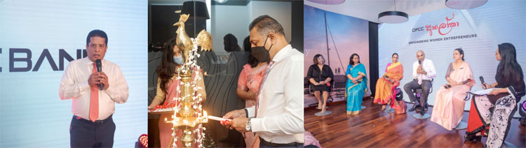 Photo Caption: L-R: Mr Lakshman Silva, Chief Executive Officer DFCC Bank addressing the gathering, Mr Thimal Perera, Deputy Chief Executive Officer DFCC Bank lighting the traditional oil lamp, Panel Discussion with Mrs Sandra de Zoysa, Chairperson SLASSCOM & Chief Customer Officer Dialog Axiata PLC, Mrs Anojie De Silva, Chairperson of Women’s Chamber of Industry and Commerce, Senior Partner E & Y and Council Member of CA Sri Lanka, Ms Shobana Cooke, Founder and Owner of the 1948 Shop, Mr Aasiri Iddamalgoda, Senior Vice President Retail Banking & SME DFCC Bank, Mrs Shera Hassen, Vice President Head Of Pinnacle /Branch Banking Planning & Implementation DFCC Bank.