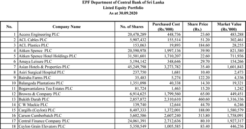 The listed equities portfolio of country’s largest retirement fund, the Employees’ Provident Fund (EPF), had increased by Rs.10 billion in the third quarter of 2020.