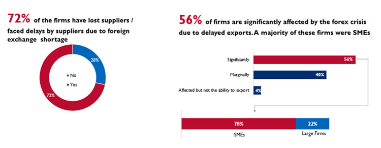Due to the foreign exchange shortage, exporters faced difficulties in sourcing production and service input, with 72% of export firms having lost suppliers or faced delays in sourcing. The majority of firms, particularly SMEs, were concerned about their ability to export in the future, due to production/service delays or losses in suppliers resulting from forex shortages.