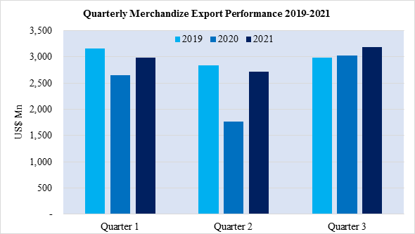 Merchandize exports recorded during the third Quarter of 2021 increased by 5.0% to US$ 3,182.83 Mn compared with the same period in 2020. Similarly, exports increased by 6.7% compared with the same period in 2019.
