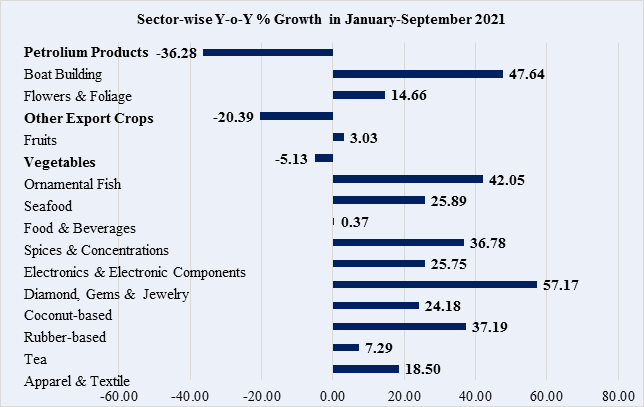 For the period of January to September 2021, merchandise exports increased by 19.3 % to US$ 8,881.93 million compared to the corresponding period of 2020, following increased exports of almost all the major product sectors; Apparel & Textiles, Tea, Rubber-based products, Coconut based products, Electronics & Electronic Components, Spices and Concentrates, Seafood and Ornamental fish as shown in the table below.
